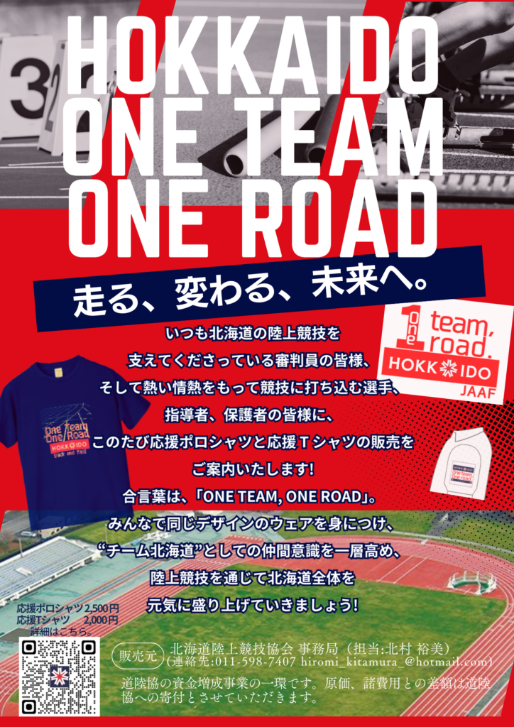 「いつも北海道の陸上競技を支えてくださっている審判員の皆様、そして熱い情熱をもって競技に打ち込む選手、指導者、保護者の皆様に、このたび応援ポロシャツ・Tシャツを販売をご案内いたします。合言葉は、『One Team, One Road』 みんなで同じデザインのウェアを身につけ、“チーム北海道”としての仲間意識を一層高め、陸上競技を通じて北海道全体を元気に盛り上げていきましょう!」