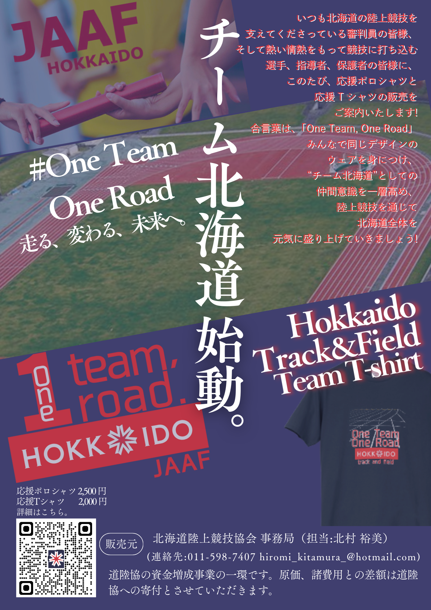「いつも北海道の陸上競技を支えてくださっている審判員の皆様、そして熱い情熱をもって競技に打ち込む選手、指導者、保護者の皆様に、このたび応援ポロシャツ・Tシャツを販売をご案内いたします。合言葉は、『One Team, One Road』 みんなで同じデザインのウェアを身につけ、“チーム北海道”としての仲間意識を一層高め、陸上競技を通じて北海道全体を元気に盛り上げていきましょう!」
